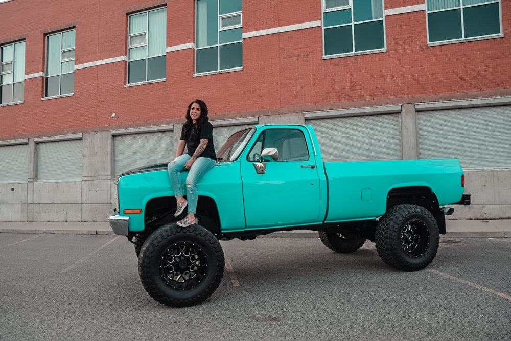 Our newest member of our team didn’t want to be outdone, so she’s shown up with one of the biggest trucks around town. Lifted 9” with 40X15 hitting the ground this truck’s 383 certainly has its work cut out for it, but no matter what speed it’s going you can spot it a mile away and it looks good! In the shop, she’s representing our front sales team and is happy to help get you a setup for your pride and joy! Don’t doubt her skills either, from a field truck to show truck, all the paint and sanding was done by her and her boyfriend, meaning she knows what she’s talking about, and just to make clear: No, you can’t have the paint code.