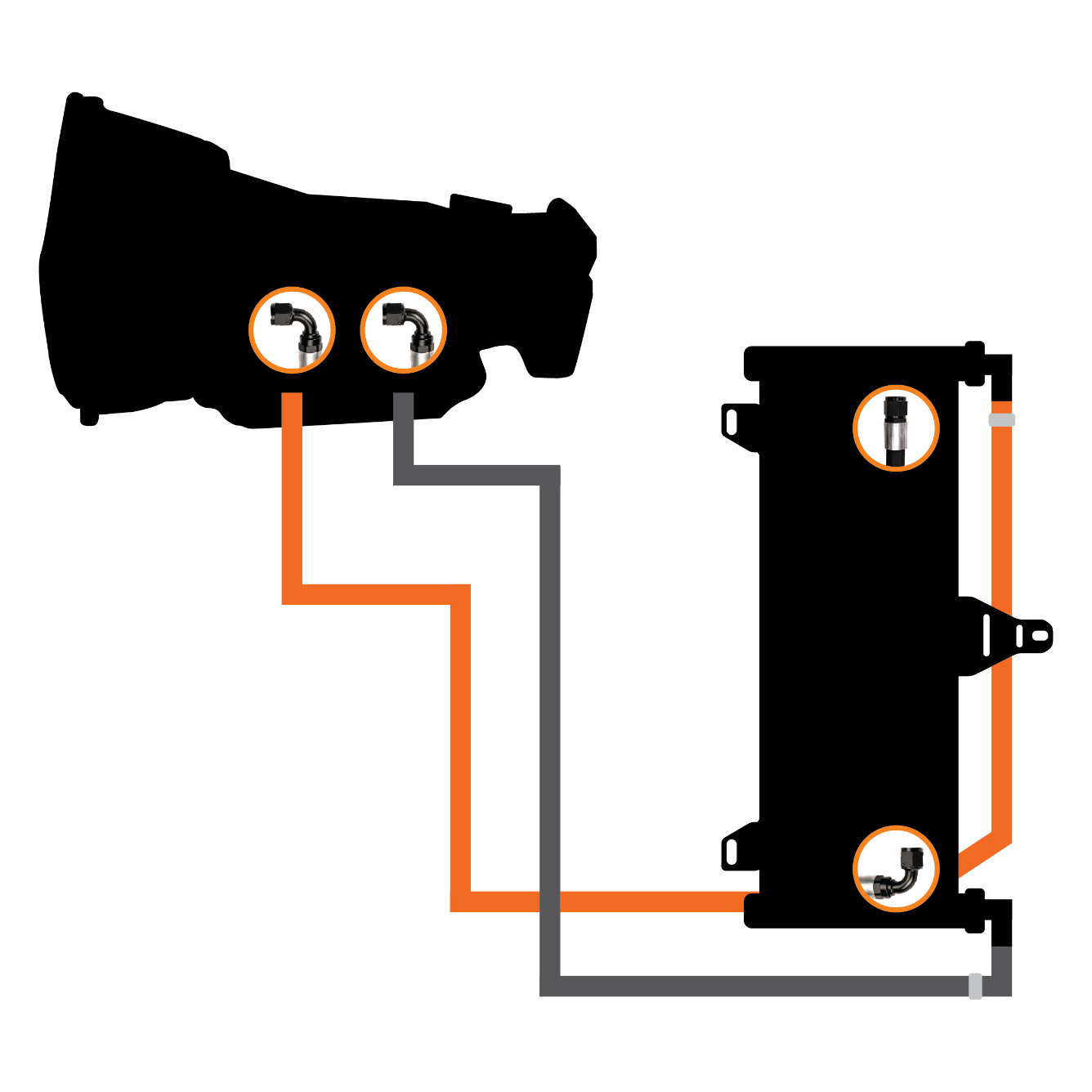 - Drop-in replacement for the factory transmission cooler with no cutting or splicing of OE lines.