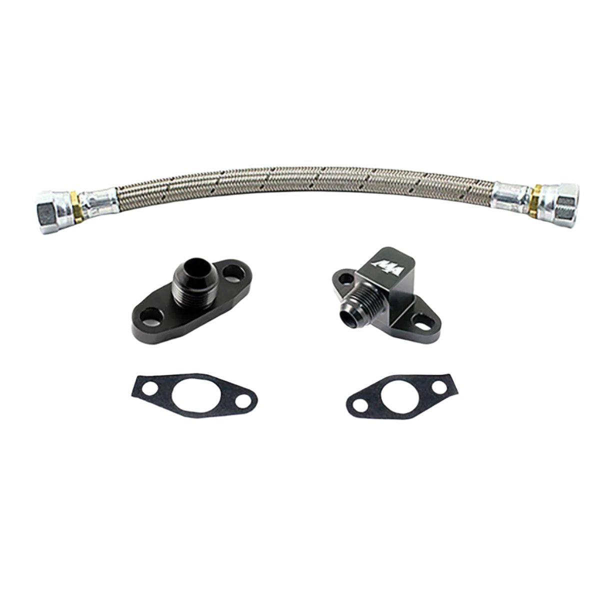 This kit is used in combination with aftermarket turbochargers based on a S-400 frame size. Drain fitting at engine mounts in place of stock drain line and uses a -10AN fitting. The opposing fitting mounts to a S-400 turbocharger and also uses a -10AN fitting. The flexible hose in between is made in-house from -10 PTFE lined braided stainless line and measures 14.25" long overall.