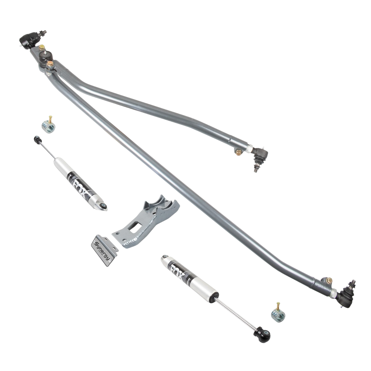 - Steering Stabilizer Clamps (4050-50): Two CNC-machined/fabricated clamps allow for secure mounting of stabilizers to the heavy-duty 1.5" Synergy tie rod.