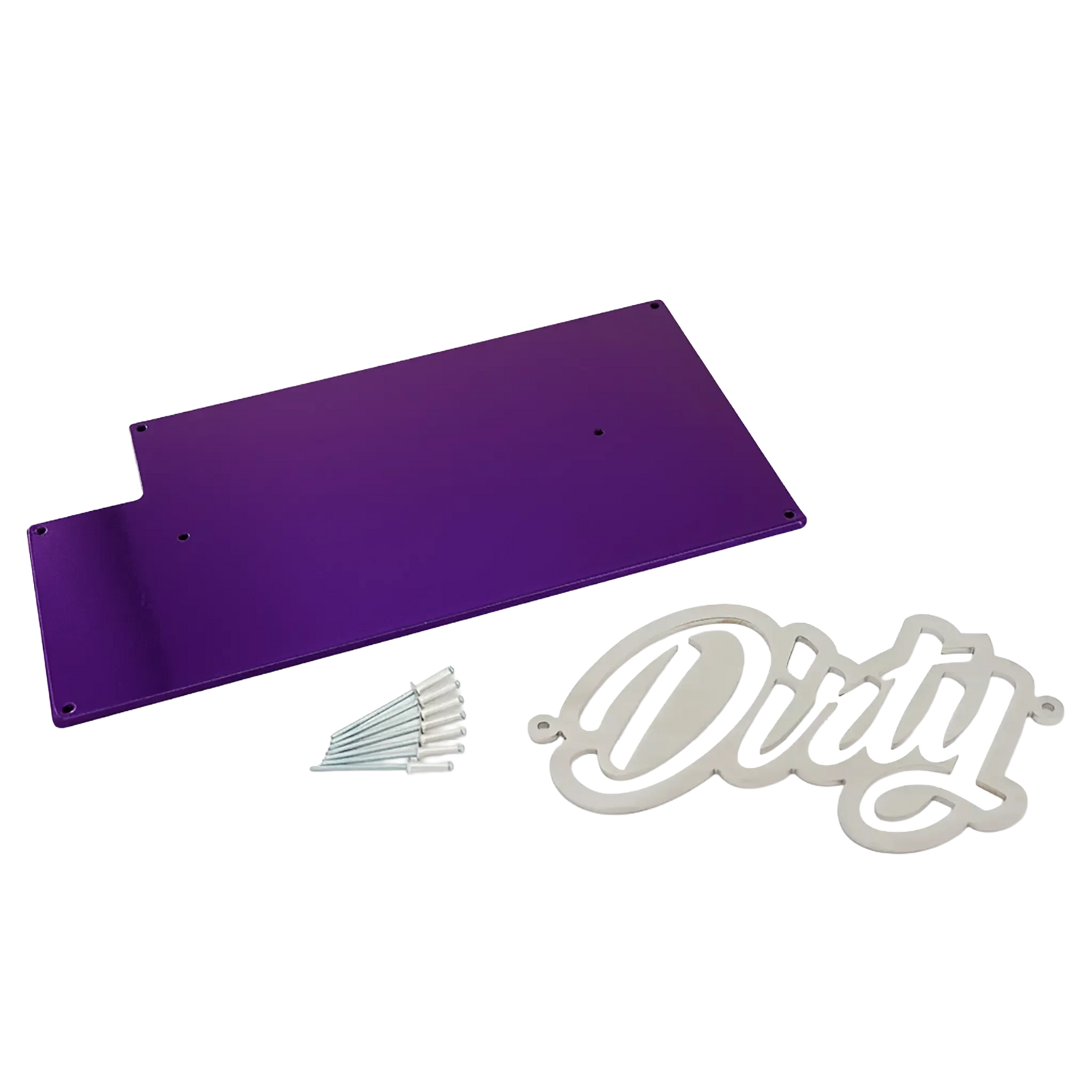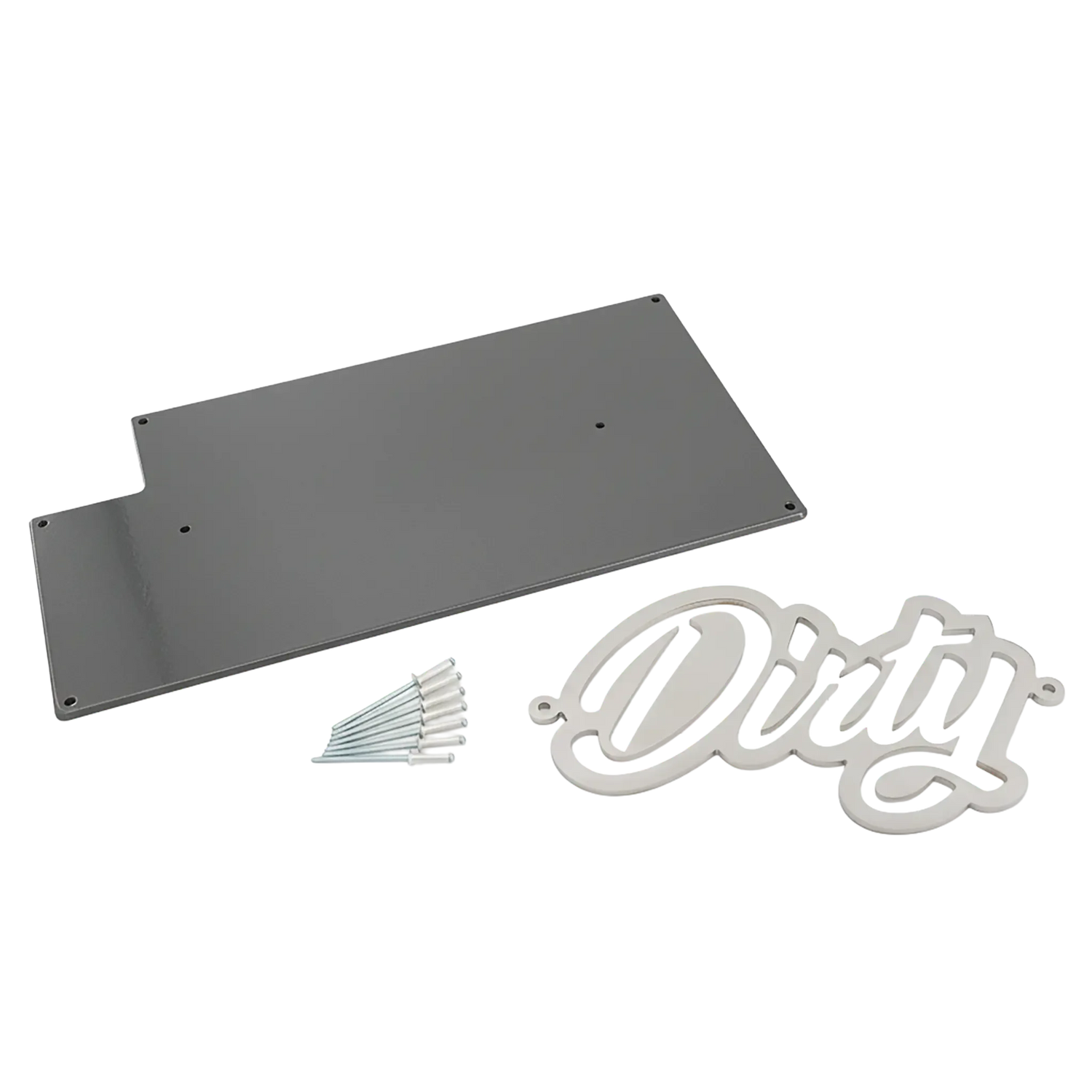 - CNC-cut stainless steel rivet-on Dirty Diesel Customs badge