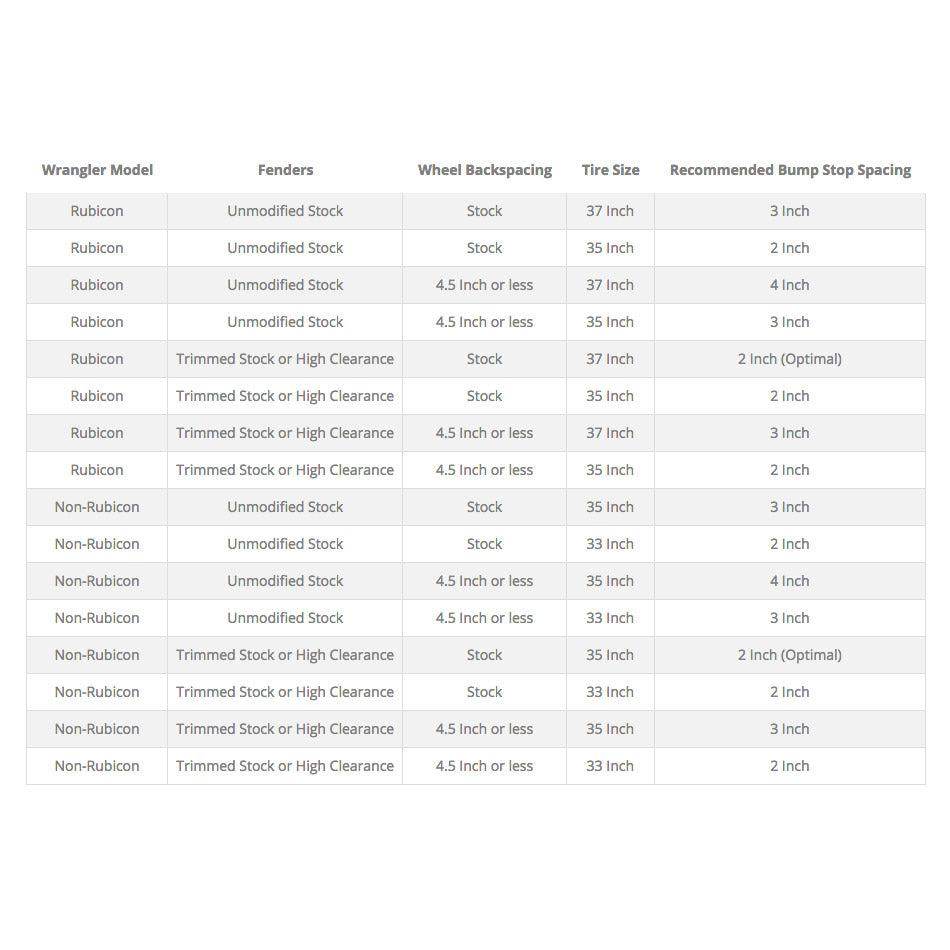 - Front and rear adjustable bump stop spacer kits are included to provide the necessary clearance required for larger tires. Bump stop spacing is adjustable from 2-4" in 1" increments without having to remove any hardware.