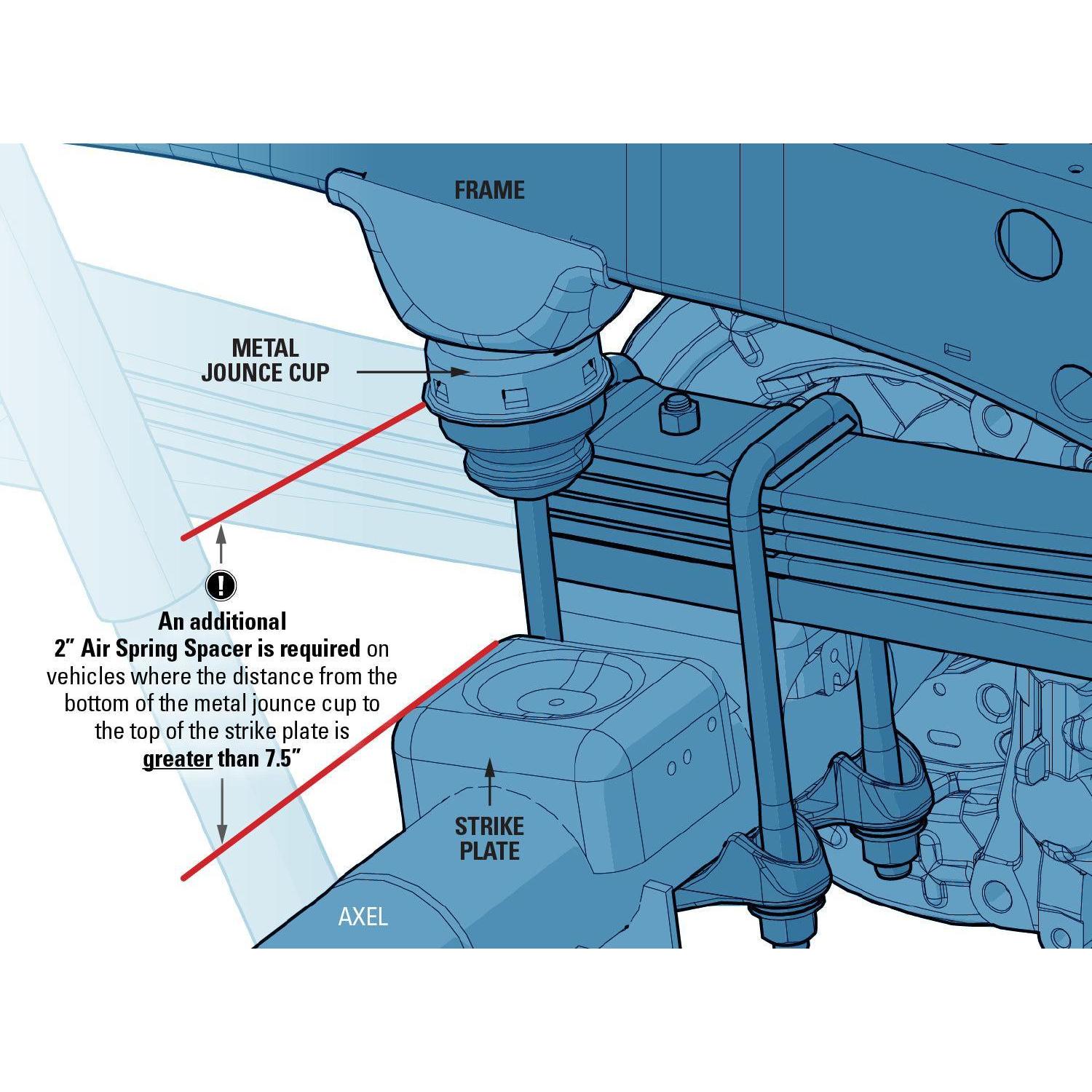 - An additional 2” Air Spring Spacer (HP10152) is required on vehicles where the distance from the bottom of the metal jounce cup to the top of the strike plate is greater than 7.5”