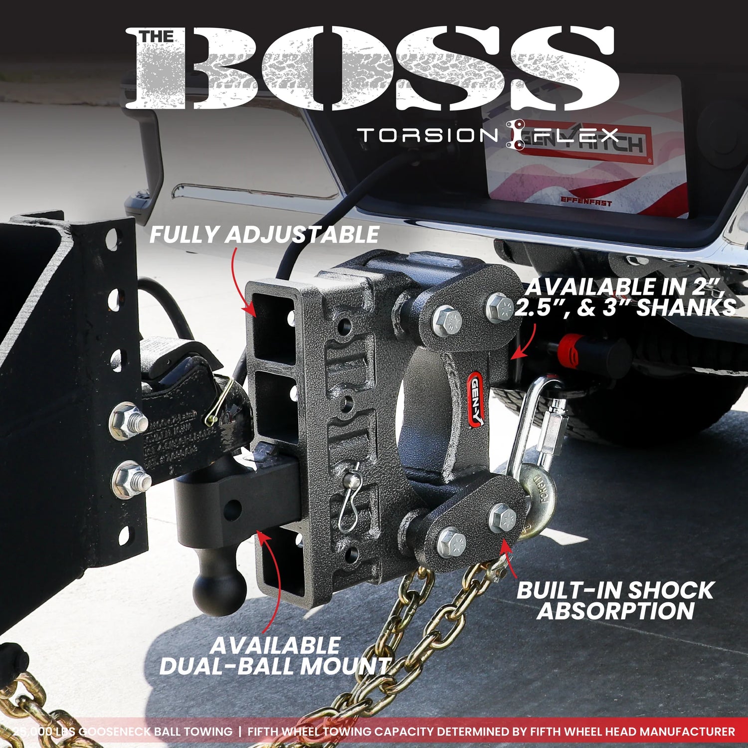 Experience the smoothest towing on the market with The BOSS 10K Torsion-Flex Drop Hitch. By fusing Gen-Y’s heavy-duty adjustable design with innovative Torsion-Flex technology, this hitch absorbs up to 90% of the inertia between your truck and trailer. The built-in suspension protects your cargo from harsh bumps, reduces trailer sway, and increases braking control by ensuring weight is distributed evenly.