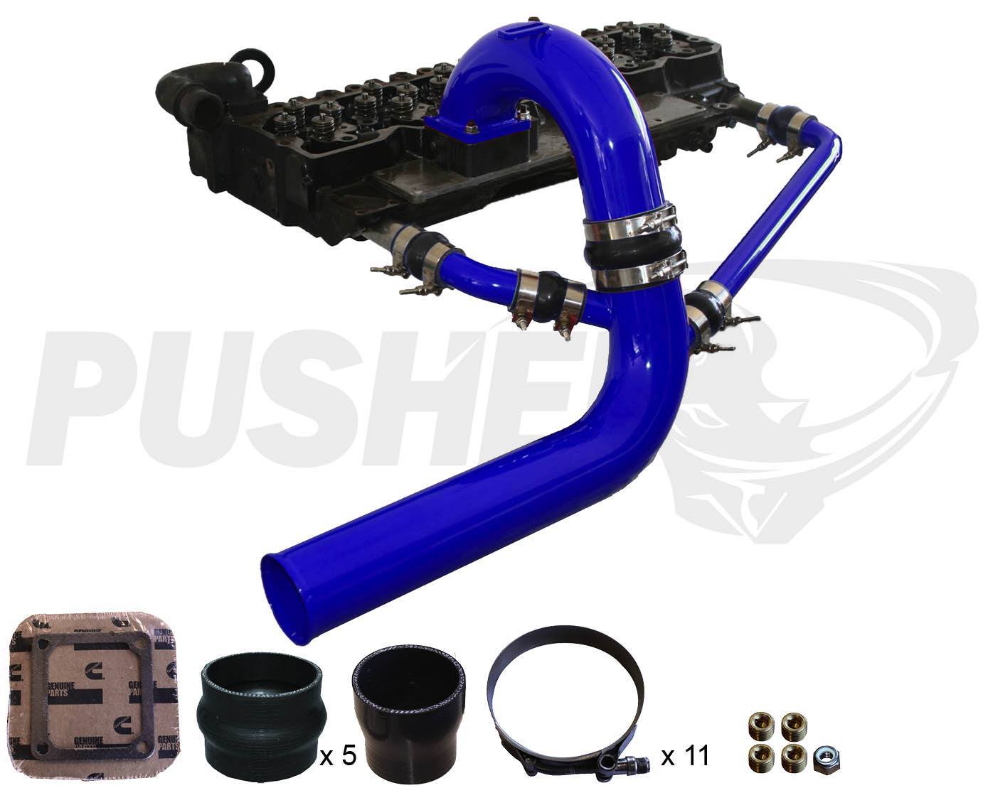 This system provides the most airflow possible to the factory Cummins's head. For durability, Pusher has constructed this system from 3.5" mandrel-bent tubing, a 1/2" thick flange, and 1/4" thick dipstick mounting bracket. The results you can expect to see from this fine craftsmanship is a decrease in EGT's, Increased MPG, faster turbo spool, increased durability, and increased throttle response!